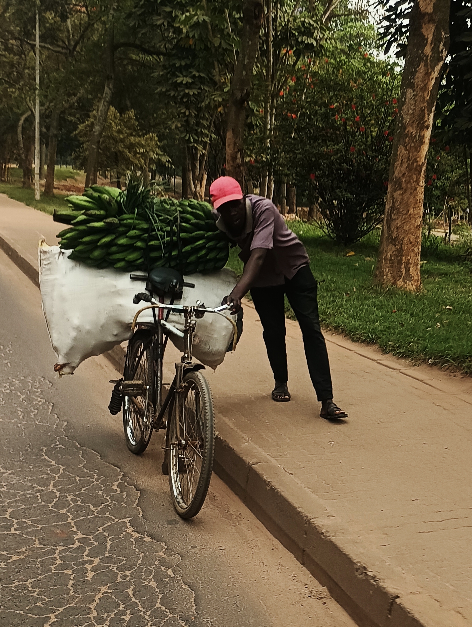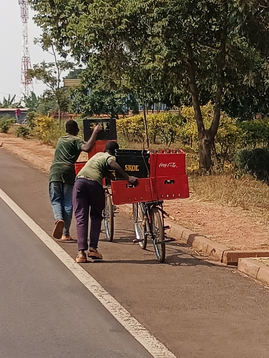 En quittant Kigali, les routes serpentent entre des collines verdoyantes sculptées par l’agriculture en terrasses. Le matin, une brume légère flotte sur les champs tandis que des vélos chargés de bananes, patates ou matériaux gravissent les côtes – un spectacle surréaliste !